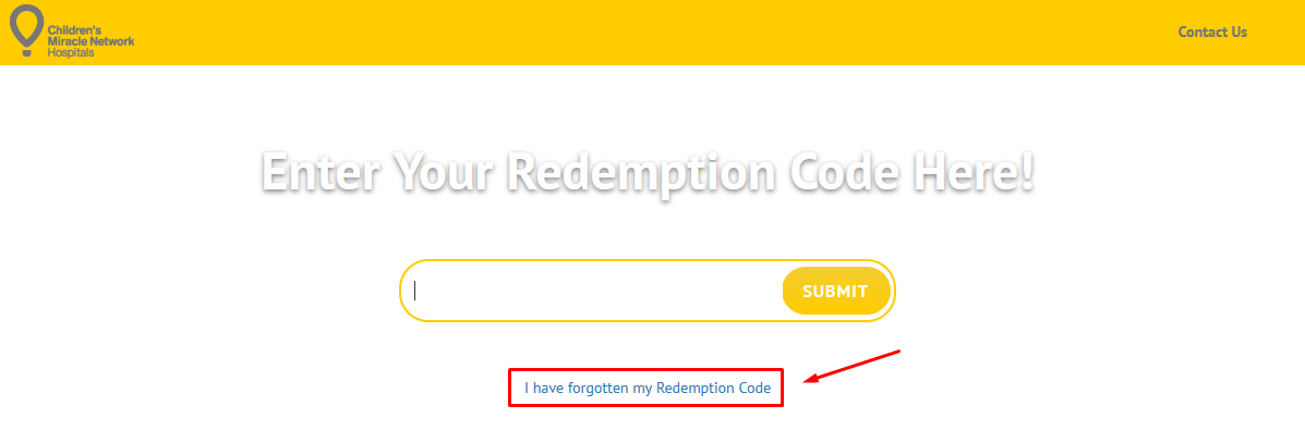 Step 1) Visit https://redeem.childrensmiraclenetworkhospitals.org and click "I have forgotten my redemption code"